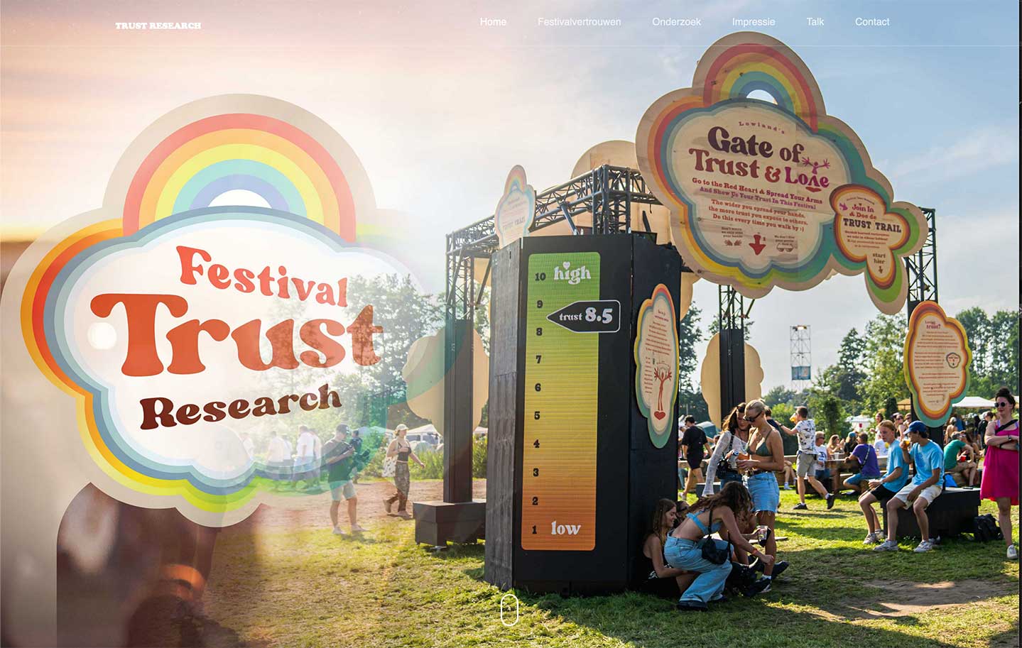 At the festival, with over 65.000 festival goers, visitors could share their trust in the 'Gate of Trust & Love' and could walk a 'Trust Trail' with reaction time experiments.